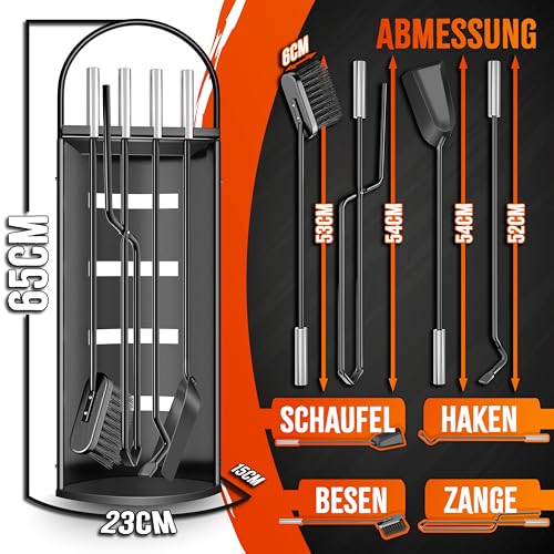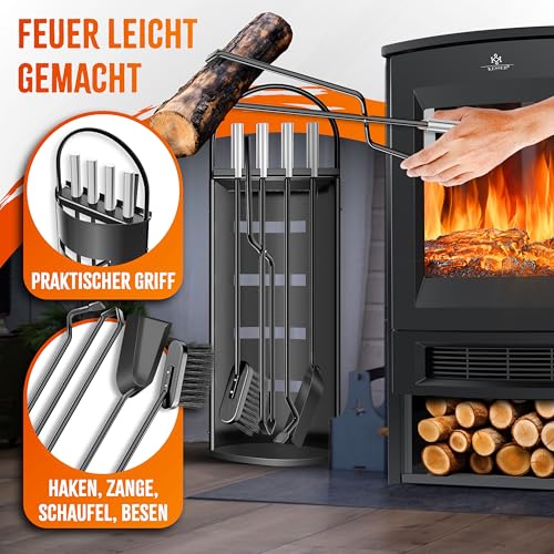 𝐙𝐔𝐁𝐄𝐇Ö𝐑-𝐒𝐄𝐓 𝐅Ü𝐑 𝐎𝐏𝐓𝐈𝐌𝐀𝐋𝐄 𝐏𝐅𝐋𝐄𝐆𝐄: Reinigungsset für Kamin, Ofen, Feuerstelle aus robustem, hitzebeständigem Stahl besteht aus 5 Teilen: 1x Ständer im halbgeschlossenen Design, 1x Kaminbesen, 1x Ascheschaufel, 1x Schürhaken und 1x Zange.