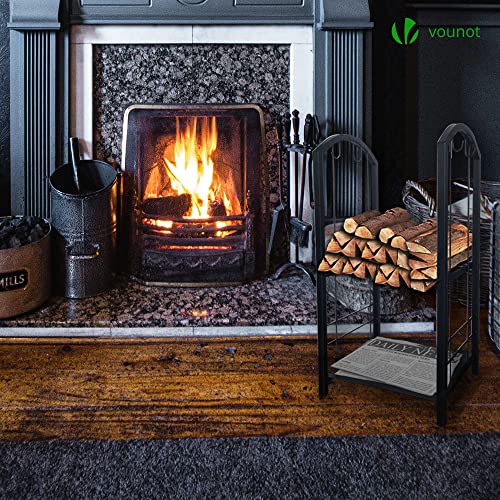 VOUNOT® Kaminholzregal mit 4 Kaminbesteck, Metall Brennholzregal für Innen und Ausse, 2 Ablagen, Schwarz, 38 x 33 x 75 cm