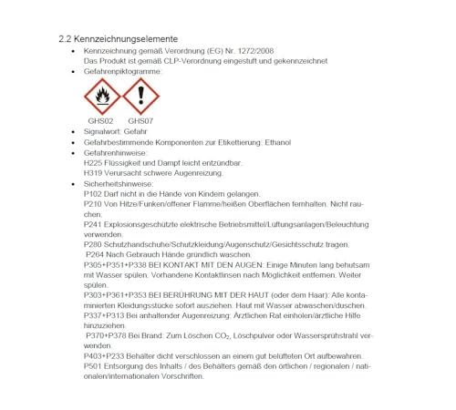 Rückstandsfreie Verbrennung: Unser Ethanol verbrennt sauber zu Wasser und Kohlendioxid, ohne Rückstände oder schädliche Emissionen zu hinterlassen. Dies bedeutet eine sauberere Umwelt und weniger Aufwand für Sie und gewährleistet ein angenehmes und umweltbewusstes Verbrennungserlebnis.