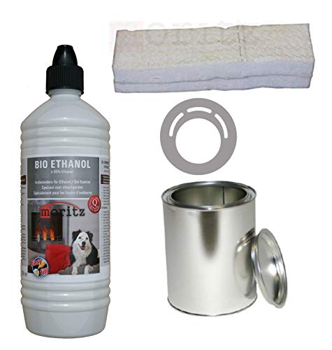 Moritz Starter Set 1 x 1000 ml Bio Ethanol + 1x Blechdose 500 ml mit Deckel + 1x Watte/Keramikwolle + 1x Sparplatte für Brenner Kamin Ofen Sicherheitsbrenner Brennpaste