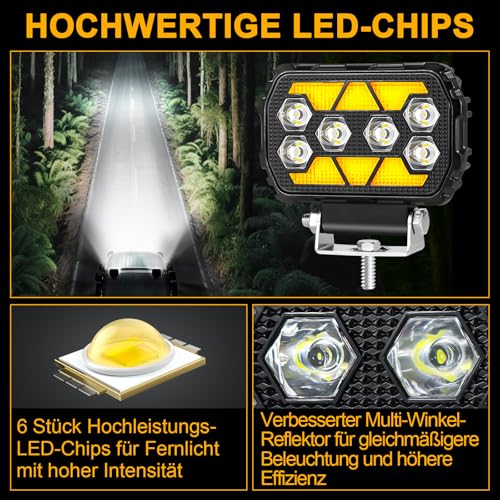 Starke Beleuchtung und Warnfunktion:Der AnTom LED-Arbeitsscheinwerfer verfügt über ein ultraweites 120-Grad-reflektierendes Optikdesign und bietet starkes, gleichmäßig verteiltes Licht, das in jeder Umgebung für klare Sicht sorgt. Ausgestattet mit 6 leistungsstarken 6500K weißen 3030-Chips und 6 stromlinienförmigen, dreieckigen 3000K gelben LEDs können Sie zwischen drei Farben und fünf Modi wählen. Das gelbe Licht kann einfach in den Blinkmodus geschaltet werden, wodurch Beleuchtung und Warnfunktion perfekt kombiniert werden, um Ihre Sicherheit zu gewährleisten.