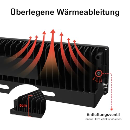Hochwertige Materialien: Strahler außen besteht aus einer integrierten Aluminiumkonstruktion in Luftfahrtqualität und wiegt 1 kg, was sie besonders robust und langlebig macht. Das verdickte Kühlsystem verhindert wirksam Überhitzung. Dank der versiegelten Flüssigsilikon-Technologie und der Schutzklasse IP67 gewährleistet sie einen stabilen und langanhaltenden Betrieb, selbst bei extremen Wetterbedingungen wie starkem Regen