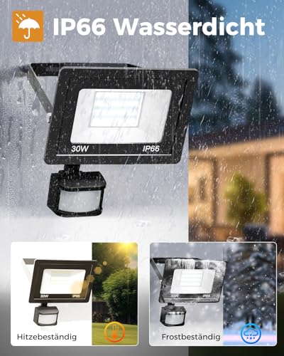 【Verbesserter PIR-Sensor】: Unsere außenstrahler mit bewegungsmelder verfügen über eine fortschrittliche Infrarot-Erkennung für sofortige und ultrahelle Beleuchtung – kein manuelles Umschalten erforderlich. Die Erkennungsdistanz und -zeit können per Fernbedienung einstellbar sein. Mit robuste Dichtungstechnologie und einem größerem, krummen Sensorkopf genießen Sie einen um 30% größeren Erkennungswinkel für höhere Empfindlichkeit, reduzieren Fehlauslöser und verbessern die Sicherheit