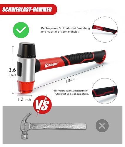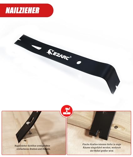 【Erweiterte Zugstange und schwerer Hammer】Die Zugstange aus extrem dickem und hochfestem Stahl hat eine vordere Kante mit einer Breite von 3 Zoll und kann leichter in die Spalten zwischen den Böden eingeführt werden. Gleichzeitig ist auf der Rückseite ein Filzpolster angebracht, um Schäden und Kratzer auf dem Boden zu verhindern. Der Schwerhammer mit seinem Glasfaserverbundgriff ist rutschfest, schockdämpfend und ermöglicht bei bequemer Handhabung eine feinere Bearbeitung.