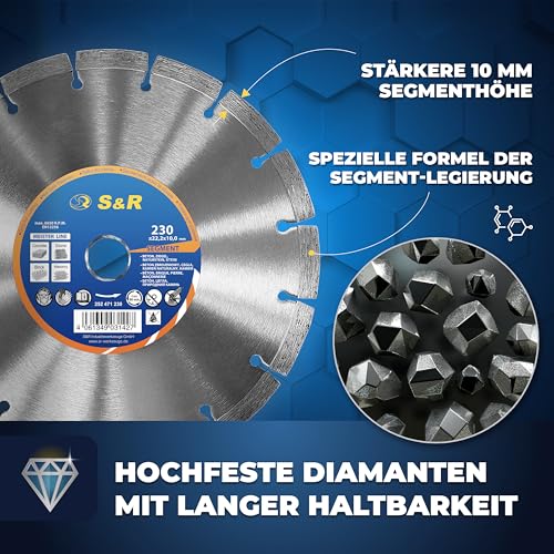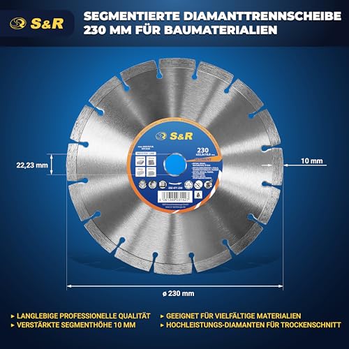 S&R Diamanttrennscheibe 230 x 22,2 mm Professional, Diamant-Trennscheibe zum Trennen von Baumaterialien, Beton, Naturstein, Stein, Ziegel, Mauerwerk, hohe Standzeit