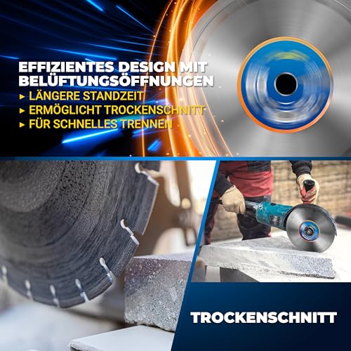 Effizienter Trockenschnitt: Dank des hochwertigen Diamantkorns und der effektiven Luftzirkulation des Segment-Designs ermöglicht die Trennscheibe saubere und präzise Schnitte im Trockenschnitt mit minimalem Materialverlust.