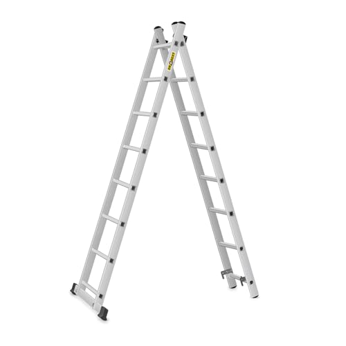 3in1-Multifunktionsleiter: Dieses praktische Aluminium-Gerüst kann im ausgeklappten Zustand als Stehleiter und Schiebeleiter verwendet werden. Dadurch ist es platzsparend und leicht zu verstauen.