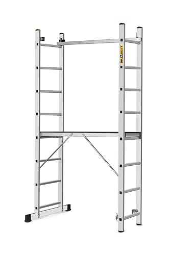 Vielseitiger Einsatz: Diese Aluleiter kann als Leitergerüst, Anlegeleiter, Bockleiter oder sogar als Baugerüst dienen. Ideal für Garten, Haushalt, Garage, Bau. Das Gerüst besteht aus zwei Aluminiumleitern und einer Arbeitsplattform.
