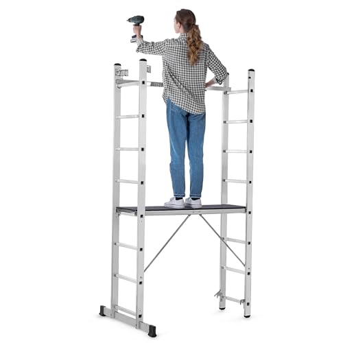 KADAX Aluminium Gerüst, 114 x 214 cm, 16-stufiges Multifunktionsgerüst mit Plattform und rutschfesten Füßen