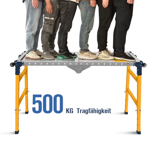 𝐒𝐂𝐇𝐖𝐄𝐑𝐋𝐀𝐒𝐓: Mit einer Tischplatte, die aus einem Stück durch präzises Zeichnen und Stanzen gefertigt ist, ist dieses tragbare Gerüst aus widerstandsfähigem Legierungsstahl gefertigt und kann beeindruckende Gewichtskapazitäten von bis zu 500 Kilogramm vorweisen.