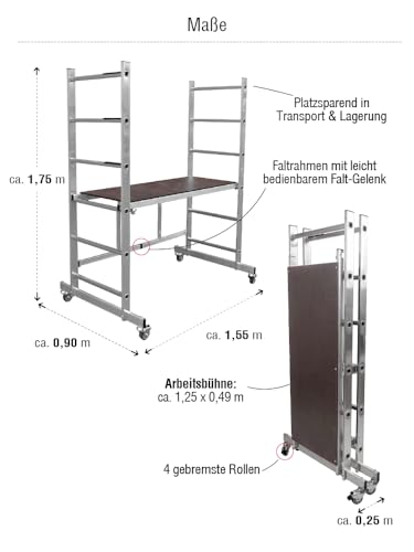 - Arbeitsbühne: 1,25×0,49 m / Aufstellfläche: 1,55×0,90 m