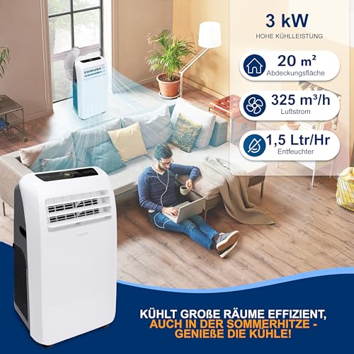 IDEAL FÜR DAS GANZE JAHR: Mit einer Kühlleistung von 9.000 BTU (ASHRAE) / 6.000 BTU (SACC) und einer Heizleistung von 9.000 BTU, ist dies die beste Option, um Platz und Geld zu sparen. Die kalte Luft kann einen Raum von bis zu 42 m² abdecken, der Luftstrom wird mit 290 m³/Stunde bewertet, Feuchtigkeitsentzug/Luftentfeuchter bei 15 Litern/Stunde mit einem Betriebsgeräuschpegel von nur 52-56 dBa.