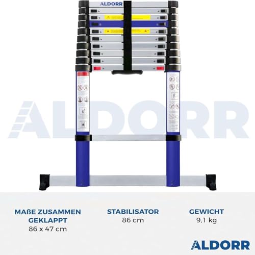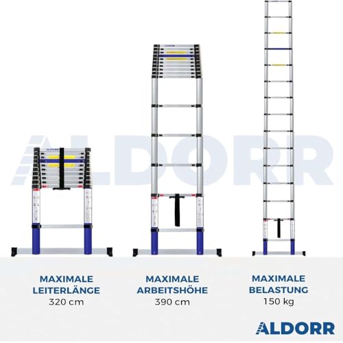 ALDORR 3,20M Teleskopleiter aus hochwertigem Aluminium – Mehrzweckleiter – Belastbarkeit bis zu 150kg – Soft-Close-System – Sicher und zuverlässig (EN131)
