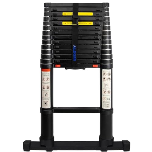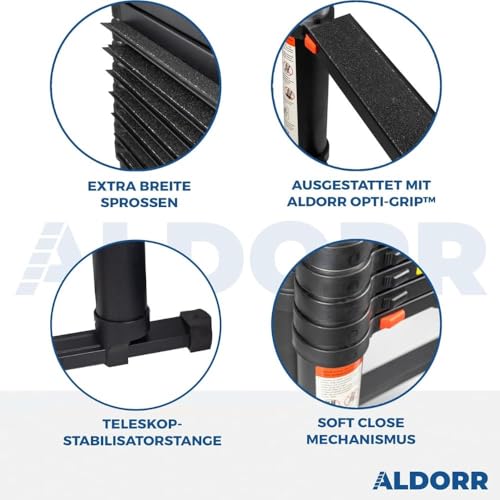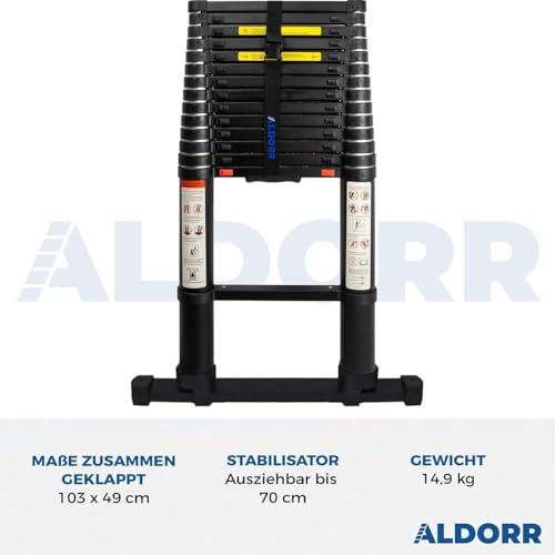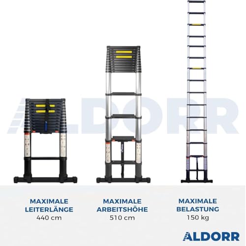 ALDORR Professional 4,40M Teleskopleiter aus Hochwertigem Aluminium – mit Teleskopische Stabilisierungsstange – Belastbarkeit Bis zu 150kg – Soft-Close-System – Sicher und Zuverlässig (EN131)
