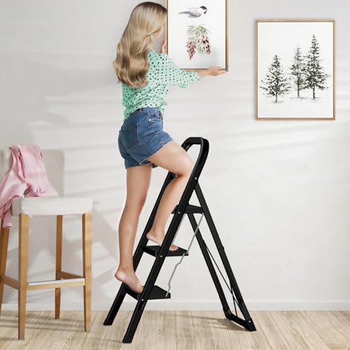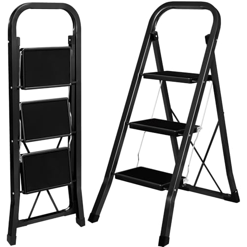 Sicherheit und Stabilität: Robuste Stahlkonstruktion, maximale Tragfähigkeit von 150 kg, bis zu den Füßen reichende und eine sichere Metallschnalle unter dem ersten Tritt, die die Leiter verriegeln könnte, verleiht dieser 3-stufigen Leiter Zuverlässigkeit, Vertrauen und Sicherheit bei der Benutzung