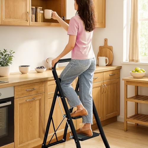 AMHANCIBLE Trittleiter, Leiter mit 3 Stufen, bis 150 kg belastbar, Klapptritt mit breitem Anti-Rutsch-Pedal und Klappsicherung, Einfach zu Verstauen, Perfekt für Küche & Haushalt, Schwarz EBSL03BK