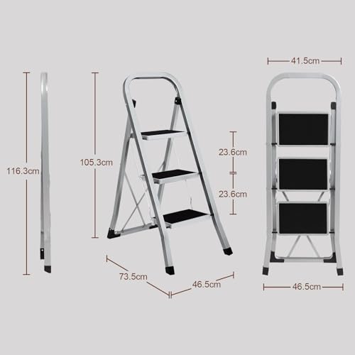 Sicherheit und Stabilität: Robuste Stahlkonstruktion, maximale Tragfähigkeit von 150 kg, bis zu den Füßen reichende und eine sichere Metallschnalle unter dem ersten Tritt, die die Leiter verriegeln könnte, verleiht dieser 3-stufigen Leiter Zuverlässigkeit, Vertrauen und Sicherheit bei der Benutzung