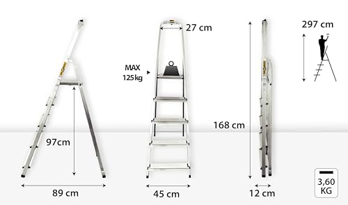 Universell einsetzbar: Die 5-stufige Trittleiter bewährt sich beim Fensterputzen oder Glühbirnenwechsel – auch für kleine Maler- und Renovierungsarbeiten unentbehrlich. Höhe der Leiter: 1,68 m Arbeitshöhe: 2,97 m