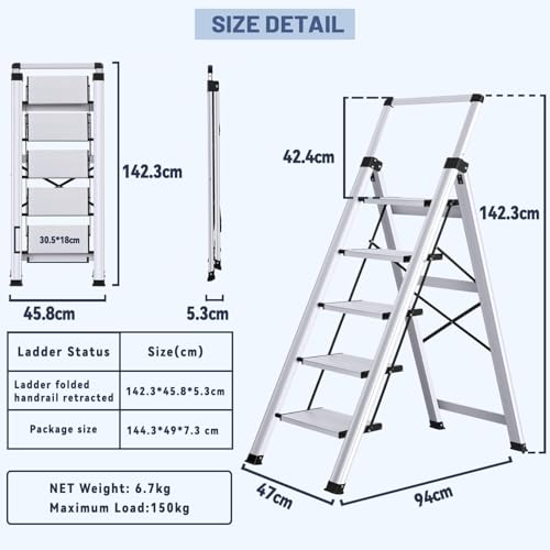 Upgrade Stufenleiter: Offen: 46 x 92.5 x 151.4 cm, Zusammengeklappt: 46 x 5.5 x 142.2 cm, Nettogewicht: 5.7 KG, Maximale Belastung: 150 KG. XinSunho Trittleiter kommt für Sie. Zusammengeklappt ist er nur 5.5 cm breit und lässt sich daher leicht in kleinen Räumen unterbringen