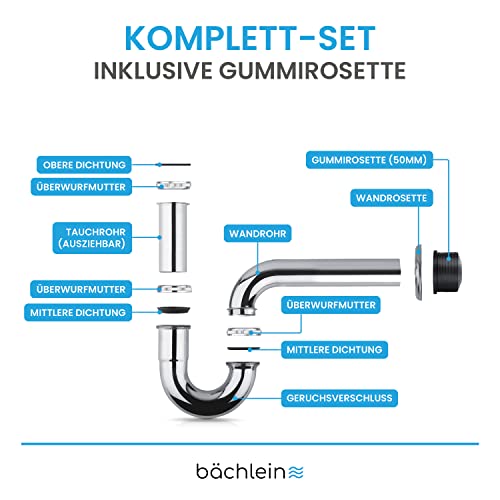 ZUVERLÄSSIGE FUNKTION – Massiver, verchromter Edelstahl und passgenaue Silikondichtungen halten den Siphon dauerhaft dicht und lassen Kalk und Korrosion keine Chance! Komplettset inklusive Rosette!