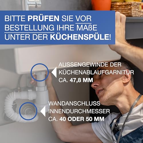 UNIVERSELLE ANSCHLÜSSE: Der Anschluss an die Ablaufgarnitur erfolgt mit einem 1 1/2″ (ca. 47,80 mm) Innengewinde (alle handelsüblichen Küchenspülen und Spülen sind mit einem genormten Einbaumaß von 1 1/2“ ausgestattet). Der Wandschluss hat einen Durchmesser von 50 mm. Bei Kürzung mit einer Säge kann der Siphon auch bei Wandabläufen mit 40 mm genutzt werden!