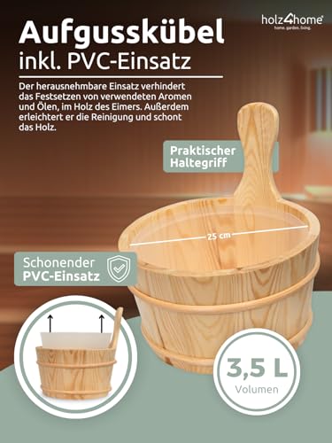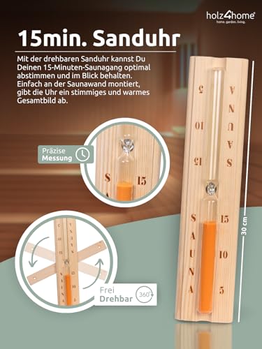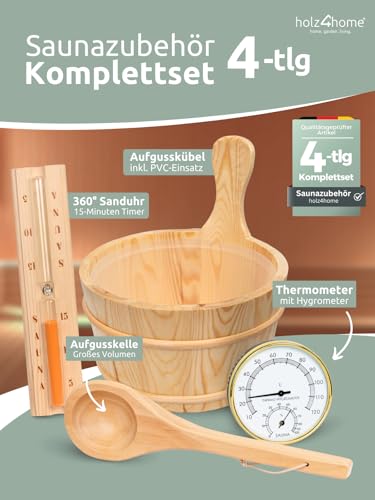 holz4home® Sauna Eimer Set I Hochwertiges Saunazubehör Eimer mit Kelle Sanduhr Thermometer Hygrometer I Hitzebeständiges Sauna Set aus Holz I Komplettset Fasssauna Saunakübel mit Einsatz