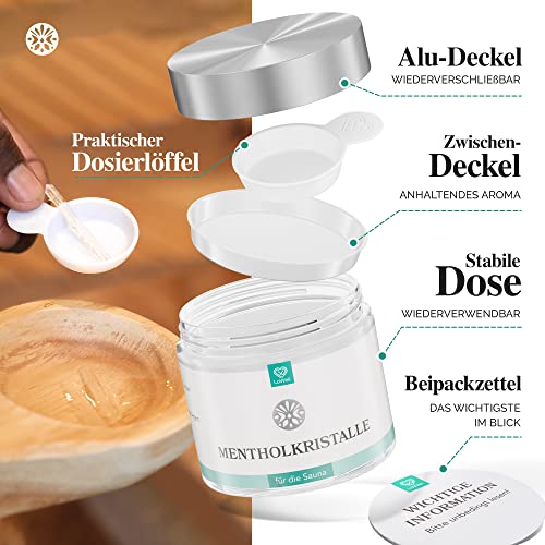 LoWell® 100g Mentholkristalle aus 100% reiner Minze – Ideal als Sauna Aufgussmittel für die Sauna in wiederverschließbarer Dose – Menthol