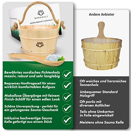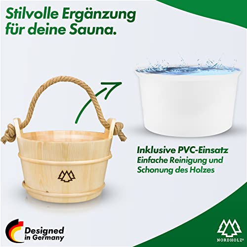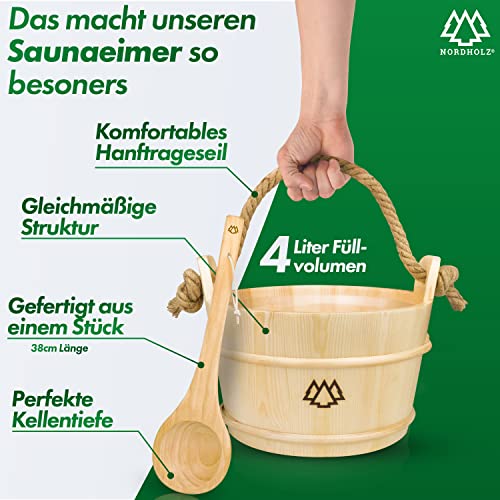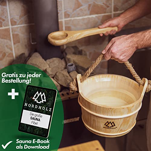 NORDHOLZ® Sauna Eimer mit Kelle aus 100% nordischer Fichte – Hochwertiges Sauna Zubehör – Einsatz, Hanftrageseil & Gratis E-Book – Wellness Aufguss Komplett Paket – Saunaeimer Set
