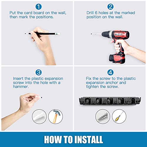 【Einfach zu installieren】Es ist einfach mit den mitgelieferten Schrauben und Dübeln zu installieren, Sie müssen nur die Positionen messen und markieren und dann Löcher bohren und die Dübel und Schrauben fixieren. Schieben Sie den Besen einfach mit einer Hand nach vorne und nach oben. Der rutschfeste Silikonschlitz mit dem Rollball passt sich automatisch der Dicke des Griffs an und hält ihn fest.