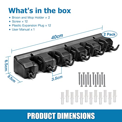 Lieferumfang: 2 Besenhalter, 12 Schrauben, 12 Wandanker, Bedienungsanleitung. Bei Problemen mit dem Mop-Halter während des Gebrauchs, kontaktieren Sie uns bitte rechtzeitig, das After-Sales-Team wird Ihre Probleme so schnell wie möglich behandeln.