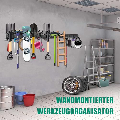 Werkzeughalter mit 4 Schienen (162 cm Gesamtlänge), 12 Haken, 2 halbrunde Haken und 2 robuste Riemen zur Aufbewahrung verschiedenster Gartengeräte.