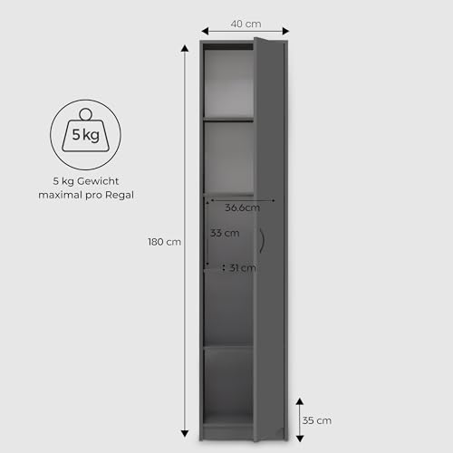 Bücherregal Kleiderschrank Regal anthrazit 40cm breit 180cm hoch Schrank Organizer Mehrzweckschrank mit 4 verstellbaren Einlegeböden Aktenschrank Regal Wand schmal Holz für Schlafzimmer Flur Büro