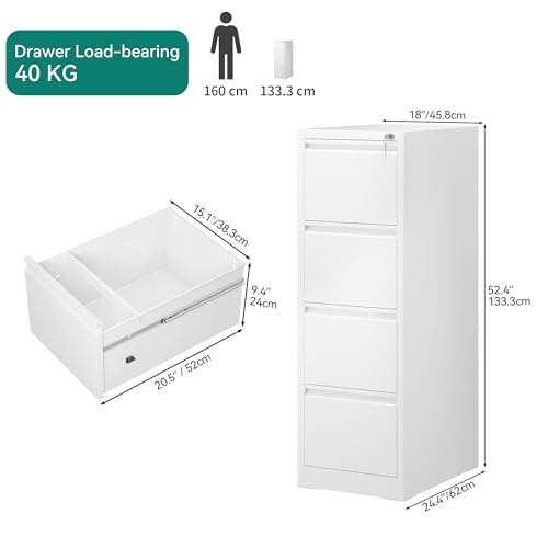 YITAHOME Aktenschrank mit 4 Abschließbaren Schubladen, Kippsicherer Rollender Aktenschrank mit Rädern für das Büro zu Hause, Unter-Pult-Aktenschränke, weiß, 62 x 45.8 x 133cm