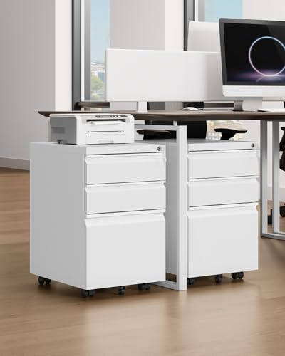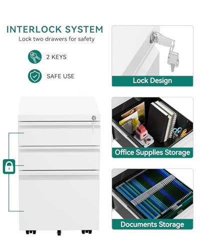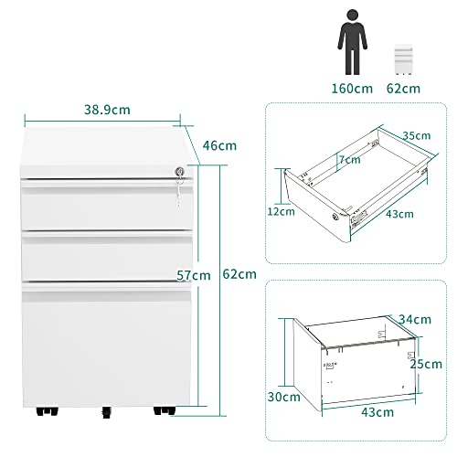 YITAHOME Mobiler Aktenschrank, Abschließbar Rollcontainer mit 3 Schubladen für A4, Legal, Letter, Metall Büroschrank mit Rollen für Home-Office, 46 x 39 x 62cm, Weiß