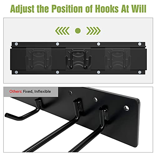 VERSTELLBARES DESIGN: Im Gegensatz zum anderen festen Gerätehalter enthält dieser Gerätehalter Gleitschienen, sodass Sie den Haken einfach verschieben können, wenn Sie die Position des Hakens ändern möchten. Außerdem sind die Haken abnehmbar und können je nach Bedarf hinzugefügt oder entfernt werden, was ihn sehr flexibel macht.