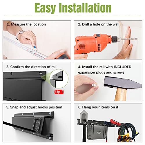 EINFACHE INSTALLATION: Ausgestattet mit Schrauben und Dübeln für eine einfache Installation. Zuerst die Montageposition bestätigen, dann Löcher in die Wand bohren und die Schienen befestigen, schließlich die Haken anbringen. Und können Sie mit dem Aufhängen Ihrer Gegenstände beginnen.