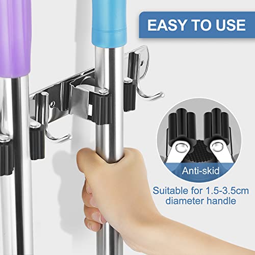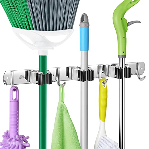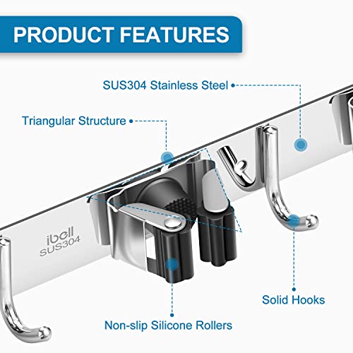 ibell Besenhalterung Wand, Gerätehalter Edelstahl mit 3 Halter und 4 Haken, Gartengerätehalter Wandhalterung Werkzeughalter Wandhaken Mopphalter Selbstklebend für Badezimmer Garten Garage