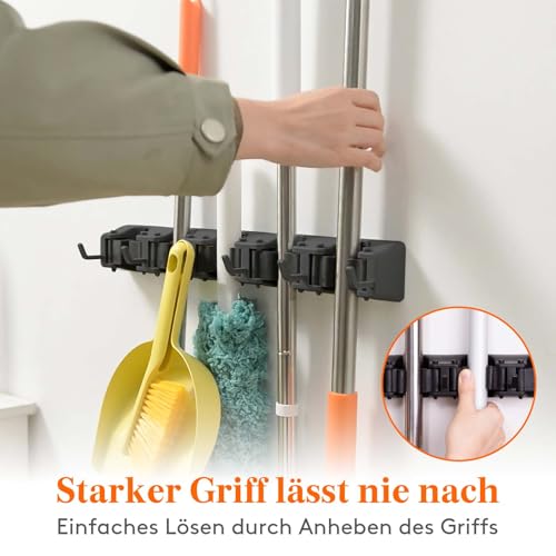 Einhändiges Drücken: Dank des einzigartigen rutschfesten Pop-Up-Griffs ist dieser Besenhalter sehr praktisch und schnell zu benutzen. Sie brauchen nur eine Hand, um Besen, Wischmopps, Kehrbleche und andere Reinigungsutensilien einfach herauszunehmen und zurückzustellen.