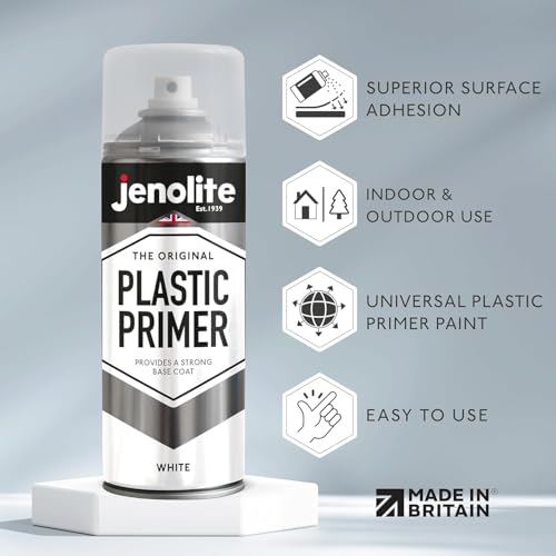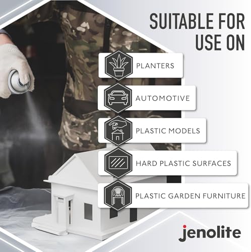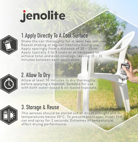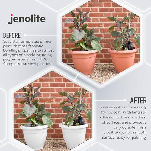 JENOLITE Kunststoff-Grundierungsspray – weiß – 400ml – hochwertige haltbare Kunststoffgrundierung (ideal für Kunststoff-Gartenmöbel, Pflanzgefäße & andere Hartkunststoffe)