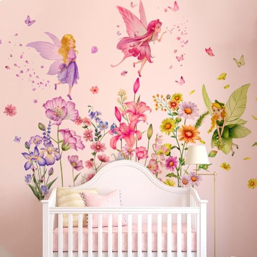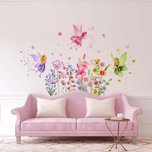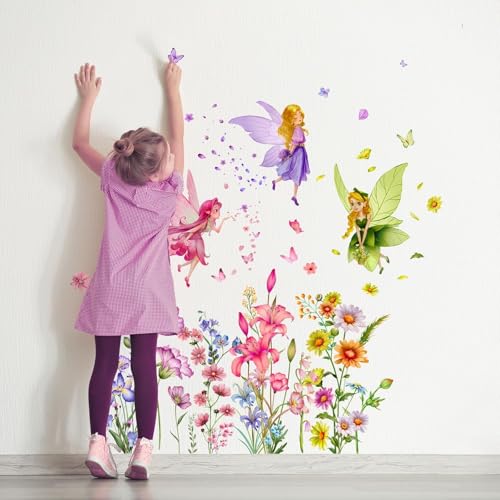 3 Blätter bunte Blumen Fee Wandaufkleber Peel and Stick Wall Decal Cute Watercolor Floral Wall Art Murals für Kinderzimmer Schlafzimmer Kabinett