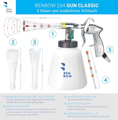 BenBow Druckluft Reinigungspistole Classic – Wirbelwind-Effekt für effiziente Schmutzentfernung im Auto – mit 1-Liter-Behälter, Trichter und Trichter mit Bürste