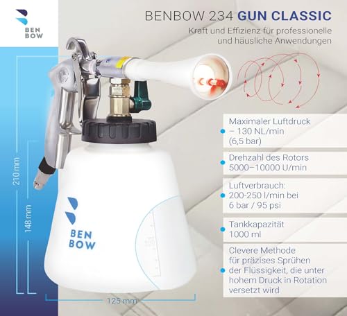 Innenraum-Profi – BenBow Auto Reinigungspistole sorgt für eine schnelle und effiziente Reinigung. Der Wirbelsturm-Effekt im Inneren der Düse wird durch einen sich drehenden Stab erzeugt, der das Reinigungsmittel aus dem Behälter ansaugt und einen künstlichen Zyklon bildet. Diese Technologie entfernt den Schmutz sofort von der Oberfläche ohne mechanischen Kontakt. Der Innenraumreiniger ist ideal für Auto-Detailing sowie die Reinigung stark verschmutzter LKWs, Busse und Baumaschinen.