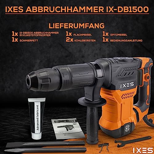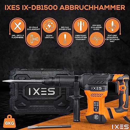 IXES Abbruchhammer IX-DB1500 inkl. Spitz- & Flachmeisel | 20 Joule Schlagkraft | 1300W Leistung | SDS Max Bohrfutter | 4100 bpm Schlagfrequenz | Stemmhammer | Schlaghammer | inkl. Kunststoffkoffer