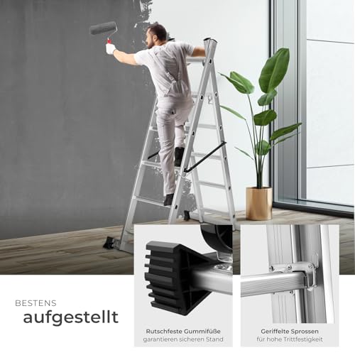 SICHERHEIT ZUERST: Wir wissen, wie wichtig Deine Sicherheit ist. Daher verfügt unsere Vielzweckleiter über vier Sicherungsstreben und Standfüße mit gummierter Auflage. Damit steht die Alu Leiter immer fest, ob Du sie als Klappleiter oder Arbeitsbühne nutzt. Die Multifunktionsleiter ist auch belastbar bis max. 150 kg – perfekt für jeden Handwerker.