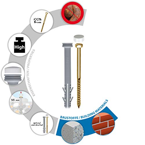 Lieferumfang: 1x Set mit Spreizdübel 8×80, Messingschrauben SW 10, Abdeckkappen weiß, je 2 Stück im Beutel, 04510139