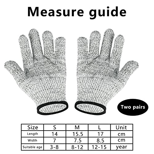 Gvolatee 2 paare schnittschutz handschuhe kinder Level 5 Schutz, Komfort schutzhandschuh, arbeitshandschuhe schnittfeste dehnbare für Küche Fleisch Schneiden, Schnitzen, Gärtnern Handschutz Kinderschutzhandschuhe können alle Arten von kleinen Unfällen im Alltag von Kindern reduzieren und die Sicherheit ihrer Hände schützen. Sie müssen sich keine Sorgen machen, dass Kinder beim Kochen, Basteln und Beschneiden von Blumen, Pflanzen und Bäumen schmutzig werden oder sich versehentlich die Hände verletzen. Perfekte Passform Schnittfeste Handschuhe aus dehnbarem Stoff sind leicht, ohne einen Hauch von Volumen, passen sich der Hand gut an, die Empfindlichkeit der Finger bleibt gleich und die Bewegungsfreiheit wird nicht eingeschränkt. 100% atmungsaktiv, machen Sie sich keine Sorgen, dass Sie sich nach längerem Tragen stickig fühlen. Hochwertige Materialien Die schnittfesten Handschuhe bestehen aus einer Mischung aus ultrahochpolymerem PE, Glasfaser, Spandex und Baumwolle, die langlebig und reißfest ist und einen Schnittschutz der Stufe 5 bietet, wodurch das Risiko von Schnittverletzungen verringert wird schwere Verletzung. Leicht zu reinigen Handschuhe sind von Hand waschbar und können auch in der Waschmaschine und Spülmaschine verwendet werden. Bitte beachten Sie: Schnittfeste Handschuhe können keine scharfen Gegenstände wie Messerspitzen oder Nadeln schützen und können Ihre Hände nicht effektiv vor Hochgeschwindigkeits-Schneidgeräten (elektrisch) schützen. Weit verbreitet Ziehen Sie Schneidhandschuhe an, die den Lebensmittelsicherheitsstandards entsprechen, ideal zum Schneiden, Schälen und Zerkleinern in der Küche, zum Basteln von Messern oder Klingen, zum Beschneiden von Ästen im Garten und zum Aufheben von Steinbruch, Glas usw. Größenempfehlung: S: 3-8 Jahre, M: 8-12 Jahre, L: 12-15 Jahre