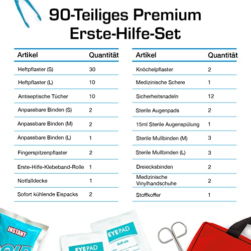 90 Essentielle Artikel: Dieses Premium Erste Hilfe Set von Amazons enthält 90 wichtige Artikel, darunter eine extra starke medizinische Metallschere, Sofort Kühlpacks, Augenspülung, Rettungsdecke & eine Reihe von nützlichen Verbandsmaterialien inkl. verschiedener Pflaster.