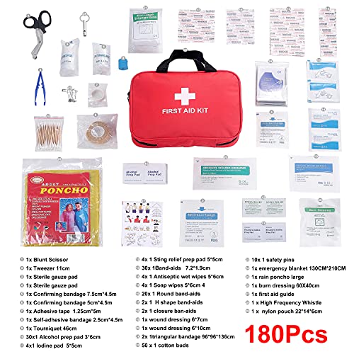Erste Hilfe Set, 180-Teiliges First Aid Kit, Kompakt Erste Hilfe Kasten mit Premium Tasche für Haus, Auto, Camping, Wandern, Sport, Arbeit, Büro, Boot, Überleben und Reisen, Klein und Leicht Rot-180p