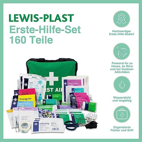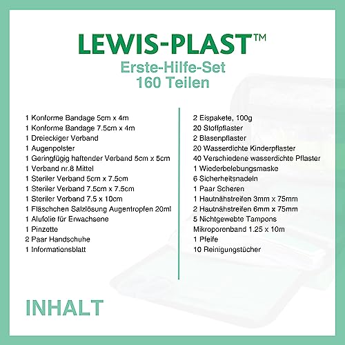 Erste-Hilfe-Kit – Das Lewis-Plast Erste-Hilfe-Kit enthält alle wesentlichen Sicherheitselemente und Zubehör, die Sie für leichte und Notfallverletzungen benötigen. Die Größen machen es perfekt für den Einsatz in Büros, Schulen und anderen Arbeitsplätzen und Außenumgebungen.
