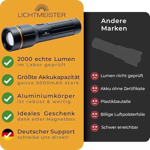 LICHTMEISTER® Taschenlampe (2000 Lumen, 5000 mAh Akku) – Taschenlampe LED aufladbar – LED Taschenlampe extrem Hell
